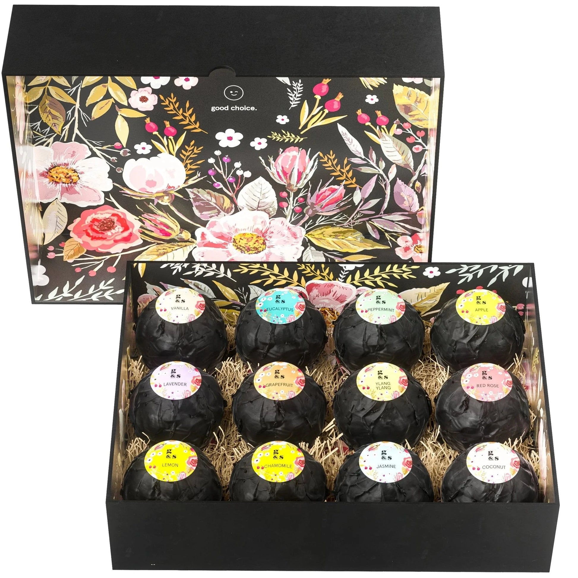 Individually-wrapped 120g bath bombs, including 12 assorted scents: Energize (Grapefruit), Keep Calm (Lavender), Good Vibes (Red Rose), Recharge (Lemon), Refresh (Peppermint), Wellness (Chamomile), Rejuvenate (Jasmine), Harmony (Vanilla), Moisturizing (Coconut), Awaken (Eucalyptus), Stay Sweet (Apple), Desire (Ylang Ylang).