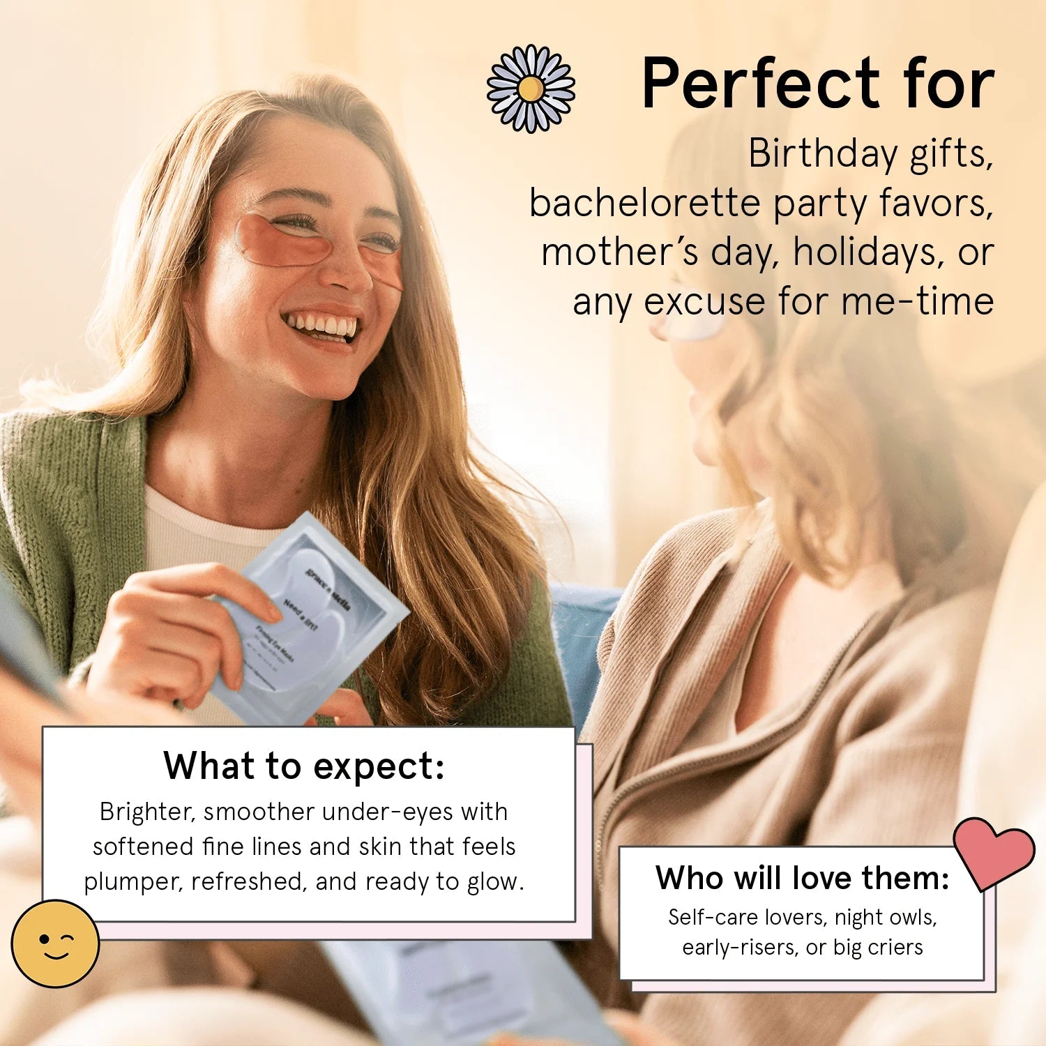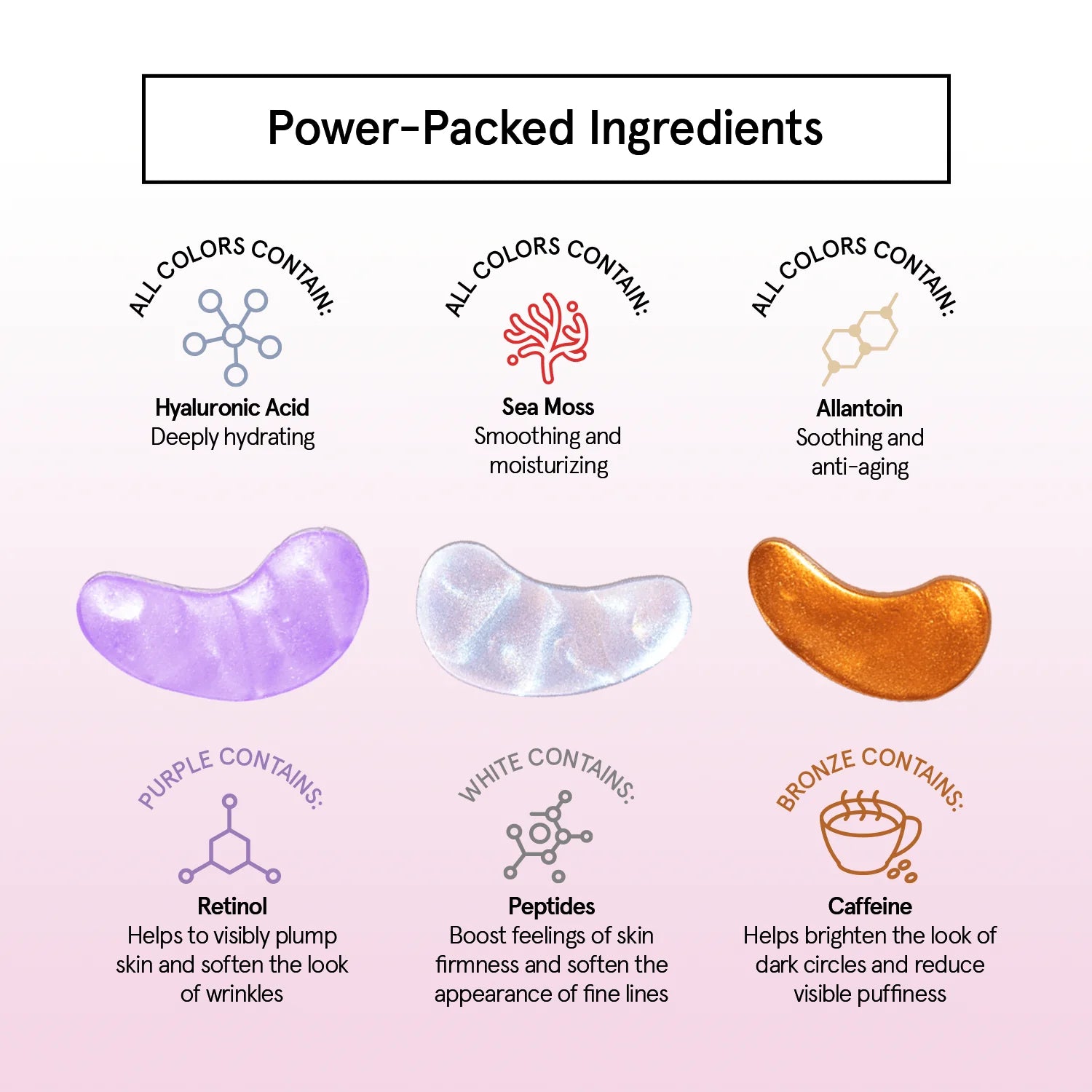 The Eye Revive Trio includes individually packaged eye masks with potent ingredients meticulously selected for their exceptional skincare benefits. The Retinol Under-Eye Masks (purple) deliver powerful anti-aging benefits overnight, harnessing the scientifically proven strength of retinol to visibly reduce fine lines and wrinkles. Enhanced with sea moss, ceramides, and essential fatty acids, these masks restore and deeply hydrate the delicate skin under your eyes, ensuring you wake up refreshed, plumped, and radiant. The Caffeine Under-Eye Masks (bronze) offer an instant pick-me-up, especially ideal after late nights or long days. Infused with caffeine and niacinamide, these patches work quickly to depuff tired eyes, reduce dark circles, and provide an energizing burst of hydration. With soothing ingredients like hyaluronic acid and glycerin, they immediately revitalize your appearance, making your eyes look brighter and more awake in mere minutes. Completing the trio, the Peptide Under-Eye Masks (pearl white) target firmness and elasticity. These firming eye patches utilize advanced peptide complexes, including Palmitoyl Tripeptide-5 and Acetyl Hexapeptide-8, to boost collagen production and restore a tighter, lifted appearance to sagging skin. Rich in niacinamide and hyaluronic acid, these masks simultaneously moisturize and smooth, leaving your under-eyes looking youthful, firm, and beautifully refreshed. Grace & Stella's Eye Revive Trio doesn't just offer skincare benefits'it elevates the entire self-care experience. Individually wrapped for hygiene and convenience, these masks are perfect for travel or quick refreshers on the go. Packaged in a charming, gift-ready box, this set makes the perfect present for birthdays, bachelorette parties, bridal showers, holiday stocking stuffers, or simply as an everyday luxury to pamper yourself or someone you love. Loved and trusted by beauty influencers and celebrities alike, Grace & Stella products have been featured on FabFitFun, Ipsy, and Boxy Charm, and even embraced by stars like Jessica Alba and Leona Lewis. Vegan, cruelty-free, and free from parabens and sulfates, the Eye Revive Trio aligns perfectly with ethical beauty standards while delivering visible, effective results. Whether you're combating daily fatigue, prepping for a special occasion, or simply indulging in a luxurious spa moment at home, the Grace & Stella Eye Revive Trio is your go-to skincare essential. Experience the power of targeted skincare and elevate your self-care routine with masks that visibly brighten, firm, hydrate, and rejuvenate. Say goodbye to tired eyes and hello to a brighter, revitalized look every single day.