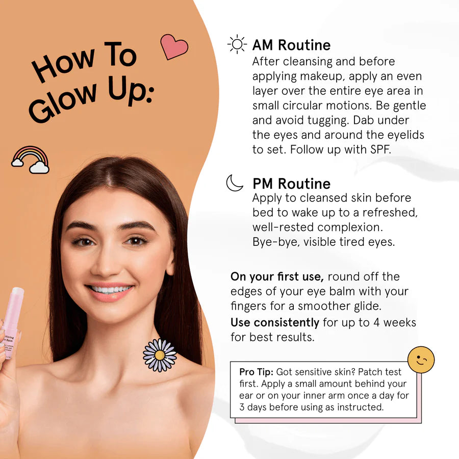 For morning use, swipe the under-eye balm gently around the entire eye area in small circular motions on cleansed skin before applying makeup. Follow up with SPF to protect against sun damage. For nighttime use, apply before bed to wake up to brighter, smoother, and well-rested under-eyes.
